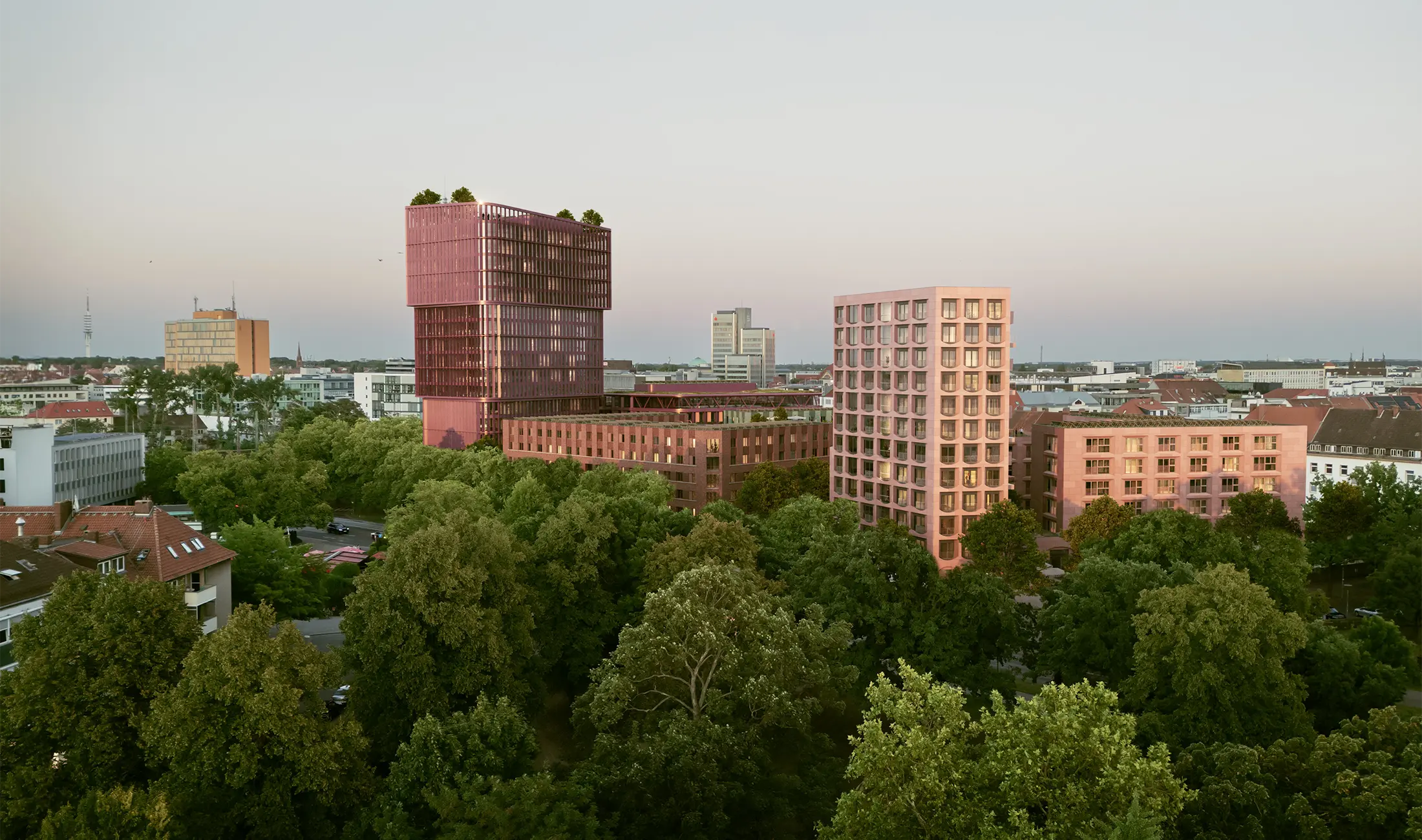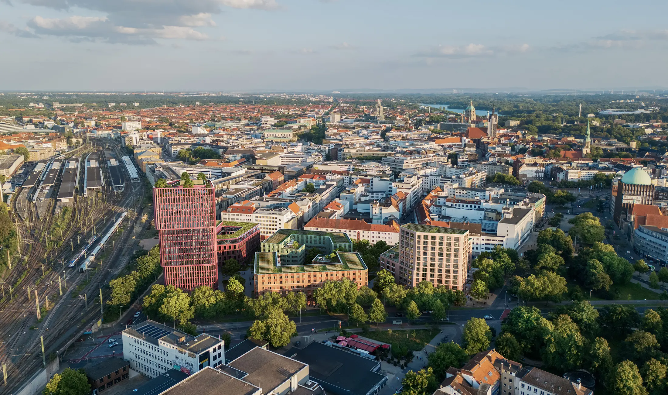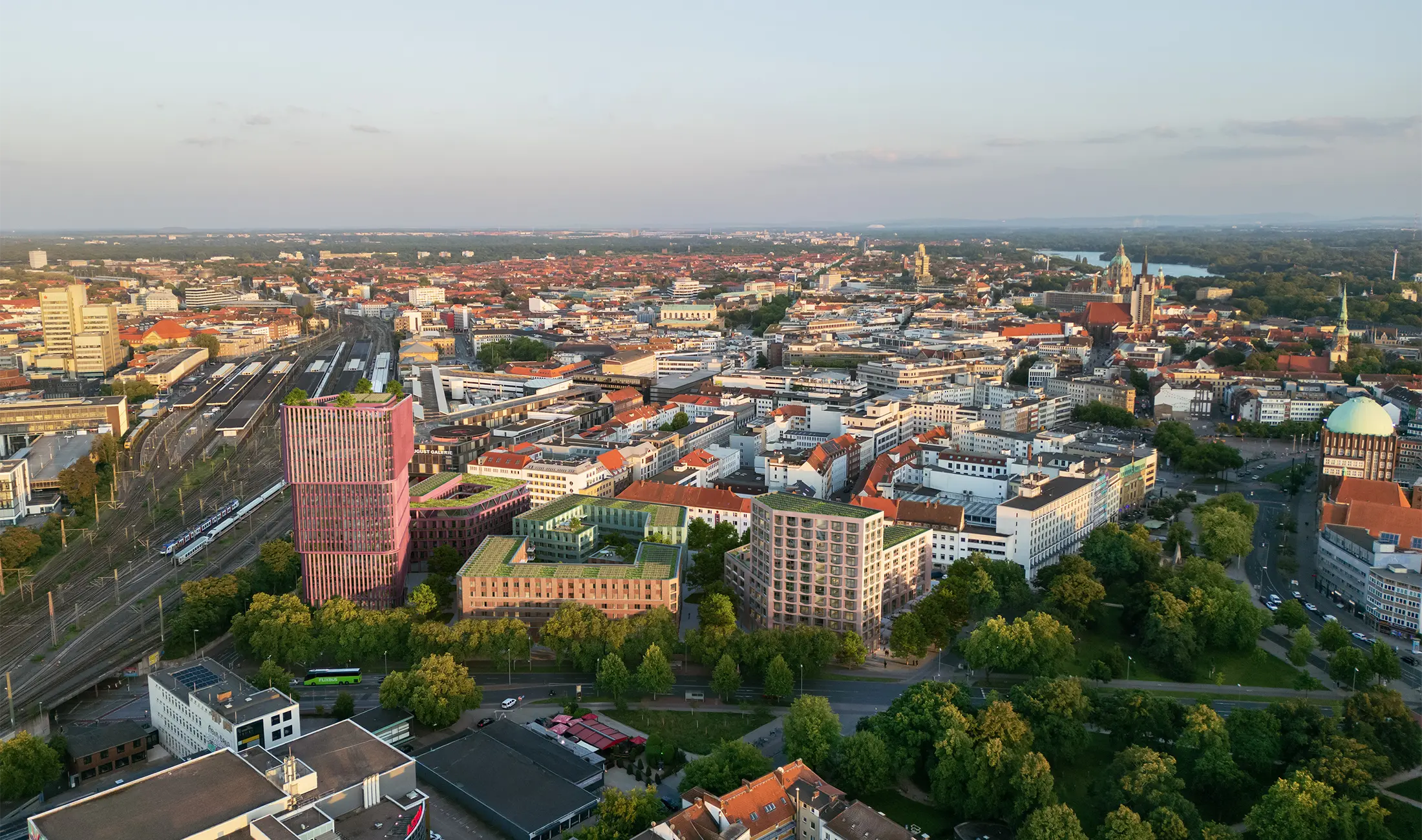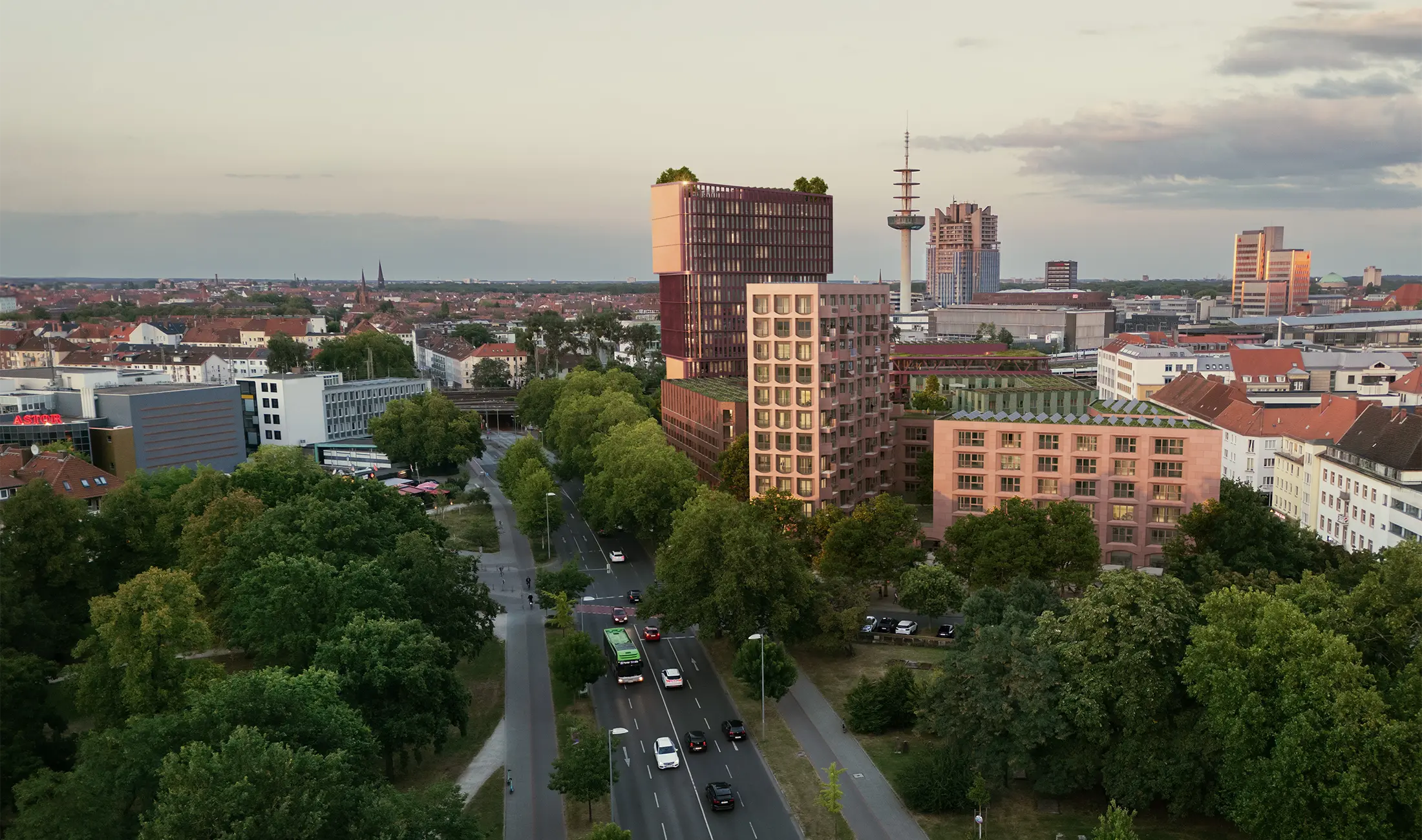 Auf Baufeld A entsteht ein 12-geschossiger, begrünter Charakterkopf für Hannovers neue Mitte – mit 40 Metern Höhe. Gewerbliche Nutzflächen im Erdgeschoss bilden eine stabile Basis für darüberliegende Wohnangebote.